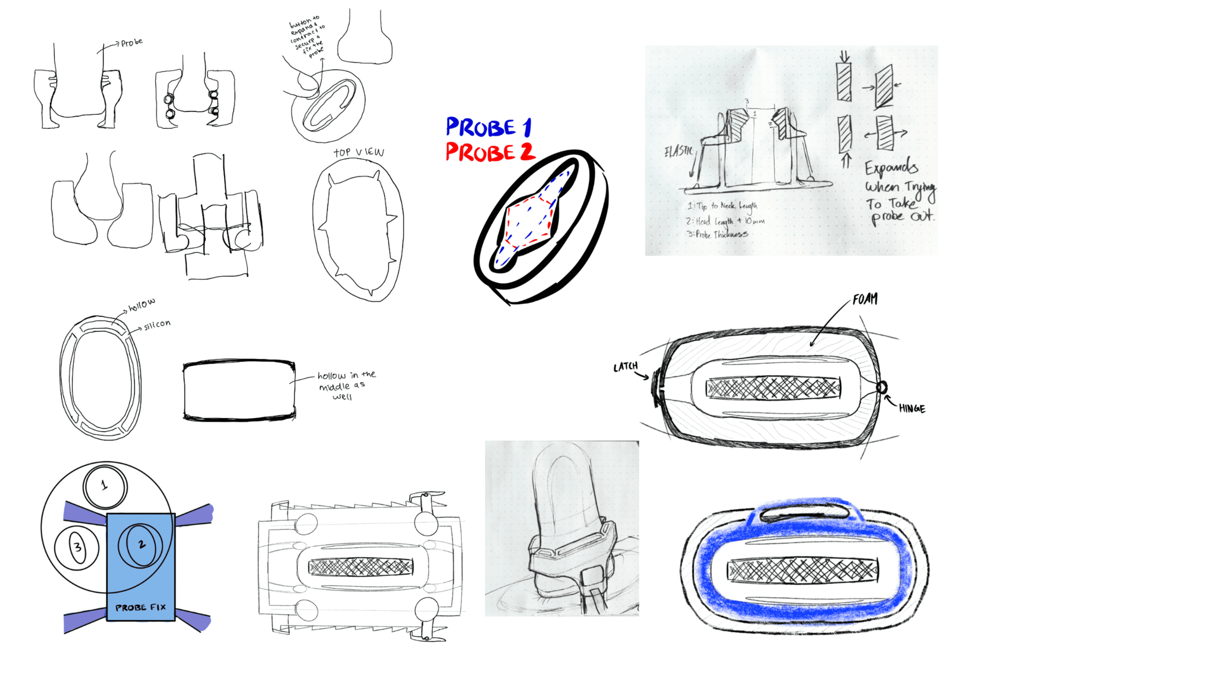 The process started with Research into the material, especially for the Universal Probe Adapter, Prototyping with cardboard, silicone casting and 3D printing, ideation with the designer team with sketching, discussing with the Usono team and testing with the final prototype before the final demo.